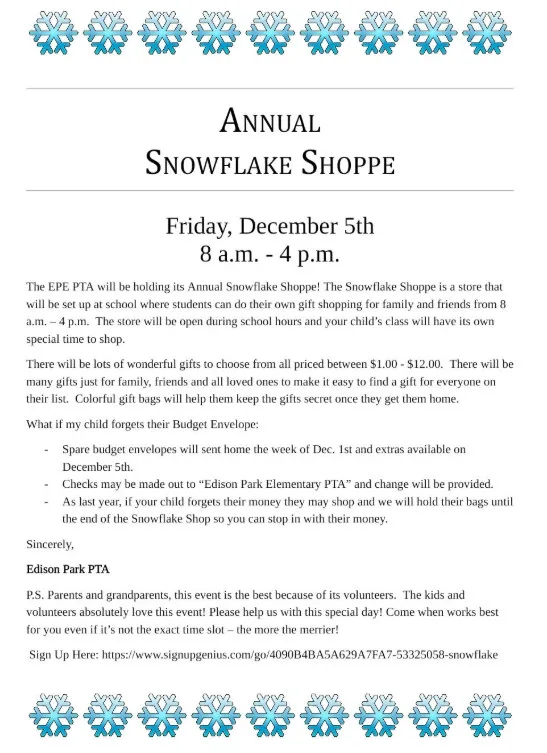 - Friday, December 5th: Snowflake Shoppe (see details below)